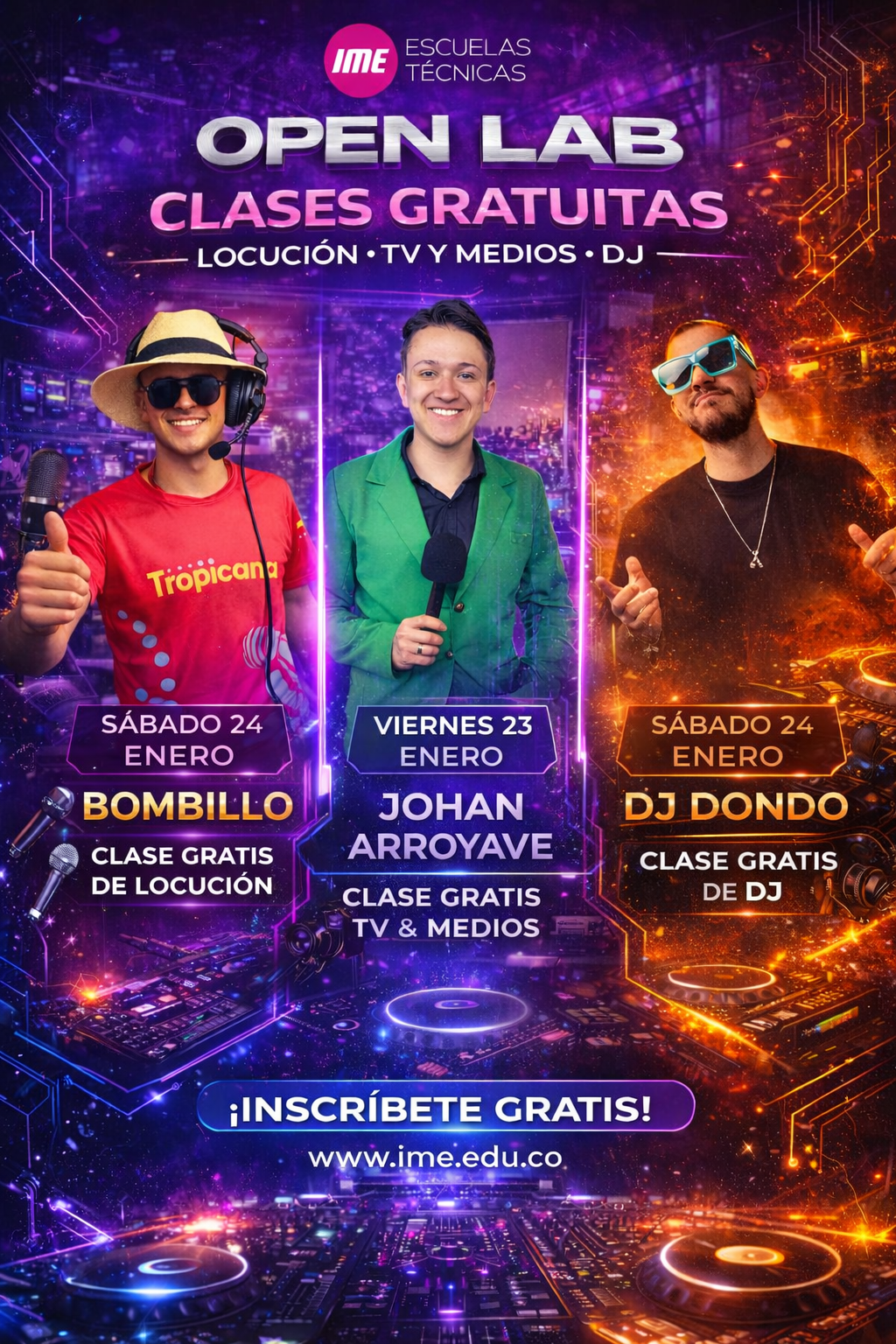 ¿Alguna vez soñaste con estar frente a un micrófono, crear tu propio beat o participar en una producción de televisión? El Open Lab IME es tu oportunidad de vivirlo. Este evento gratuito te abre las puertas a nuestras escuelas técnicas de DJ y Composición Musical, Locución y TV y Medios, donde podrás disfrutar de clases prácticas, conocer nuestros laboratorios y experimentar lo que significa ser parte de la comunidad IME.